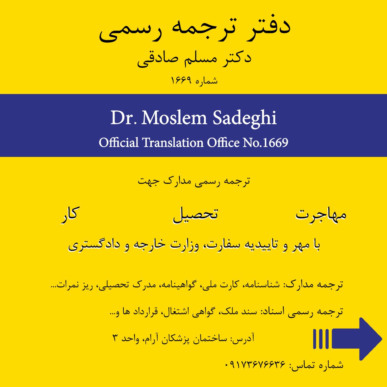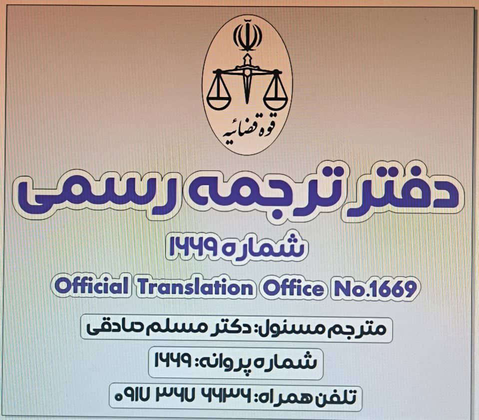 دفتر ترجمه رسمی شماره 1669 با مدیریت دکتر مسلم صادقی مترجم رسمی قوه قضائیه ارایه دهنده ترجمه 1.کلیه اسناد هویتی شامل شناسنامه ، کارت ملی، پایان خدمت، گواهینامه ، گذرنامه و ... 2.اسناد تحصیلی شامل دانشنامه ، ریز نمرات، گواهینامه تحصیلی ، تقدیرنامه ، توصیه نامه و ... 3.اسناد رسمی شامل سند ازدواج ، ملک، طلاق ، بیع نامه وکالت نامه دفتری ، اسناد رسمی دفتر خانه ، اقرار نامه، شهادت نامه و ... 4.اسناد مالی، بانکی، مالیاتی و حمایت نامه مالی... 5. قبوض موبایل ، برق اب، تلفن و ... 6. اسناد مربوط به ثبت شرکتها، اساسنامه ، آگهی ثبتی، آگهی تغییرات شرکت، آگهی روزنامه، اظهارنامه شرکت ، ثبت تجاری...دفاتر تجاری 7. احکام صادره از دادگاه ، ابلاغیه، احضاریه ، سو پیشینه ، کارشناسی دادگاه... 8. سوابق کاری ، حکم کارگزینی ، لیست بیمه، فیش حقوقی ، اشتغال به کار و ... 9. کلیه عقود و قراردادها شامل عقود بین المللی بین شرکتها و قراردادهای داخلی *اخذ کلیه تاییدات ترجمه با مهر مترجم رسمی ، دادگستری ، امور خارجه و تاییدیه سفارت*